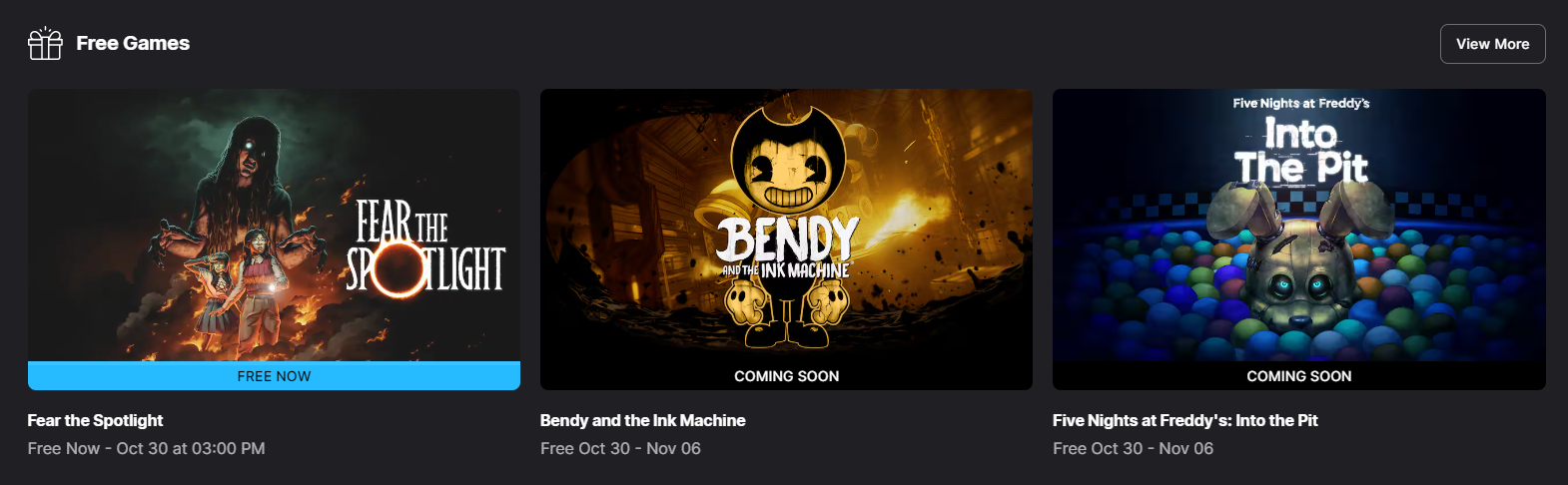 Fear the Spotlight está disponível gratuitamente até 30 de outubro às 15h00, enquanto Bendy and the Ink Machine e Five Nights at Freddy’s: Into the Pit poderão ser resgatados entre 30 de outubro e 6 de novembro.