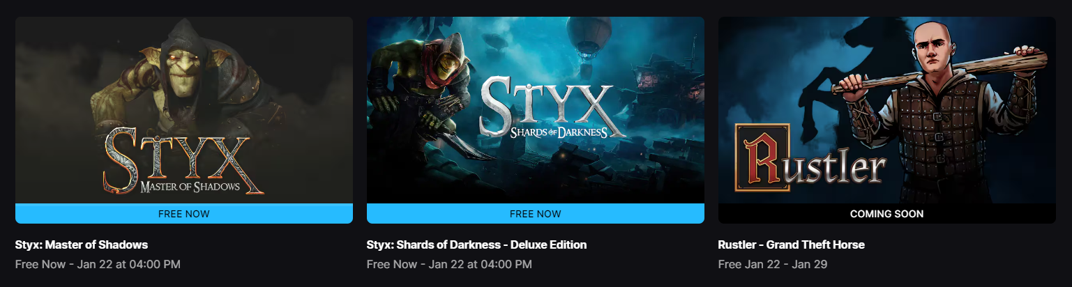 Até ao dia 22 de Janeiro, às 16h00 (hora de Portugal continental), é possível adicionar à biblioteca sem qualquer custo Styx: Master of Shadows e Styx: Shards of Darkness – Deluxe Edition. Ambos os jogos apostam numa jogabilidade focada em stealth, colocando o jogador no papel de um goblin sarcástico que se infiltra em ambientes hostis, utilizando sombras, armadilhas e habilidades especiais para eliminar inimigos ou contornar obstáculos.